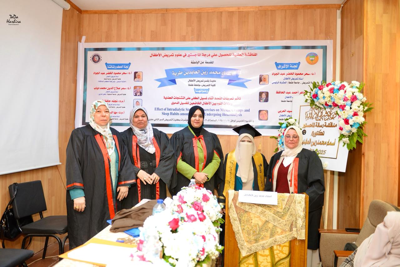 شهدت كلية التمريض جامعة طنطا، انعقاد المناقشة العلنية للحصول على درجة الماجستير في تمريض الأطفال المقدمة من الباحثة أسماء محمد زين العابدين طرية -معيدة بقسم تمريض الأطفال بالكلية، بعنوان " تأثير تمرينات التمدد اثناء غسيل الكلى على التشنجات العضلية وعادات النوم بين الأطفال الخاضعين للغسيل الدموي" وتكونت لجنة الحكم والمناقشة من: