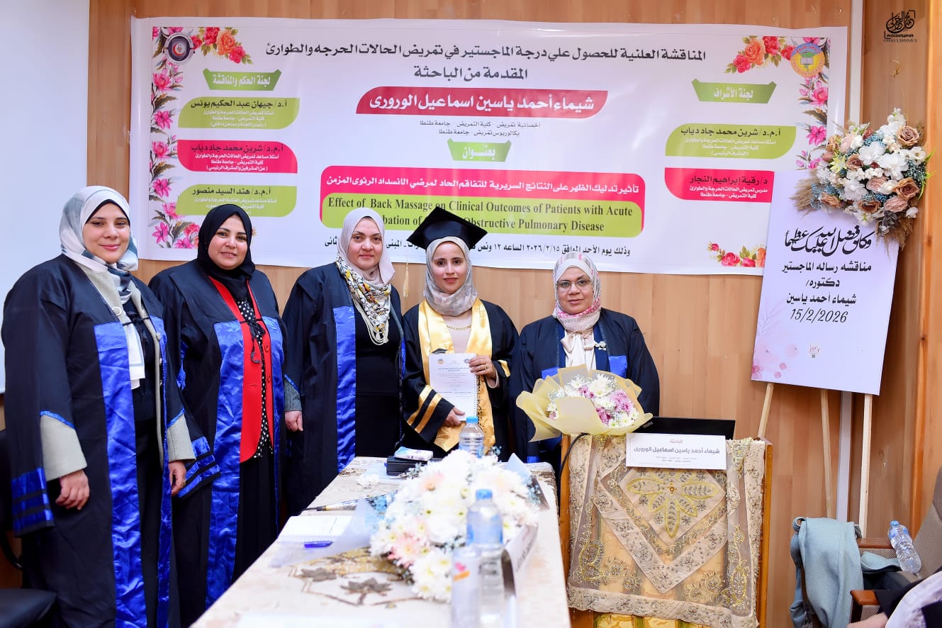 شهدت كلية التمريض جامعة طنطا، انعقاد المناقشة العلنية لرسالة الماجستير في تمريض الحالات الحرجة والطوارئ المقدمة من الباحثة شيماء أحمد ياسين إسماعيل الوروري، بعنوان "تأثير تدليك الظهر على النتائج السريرية للتفاقم الحاد لمرضى الانسداد الرئوي المزمن" وتكونت لجنة الحكم والمناقشة من: ـ