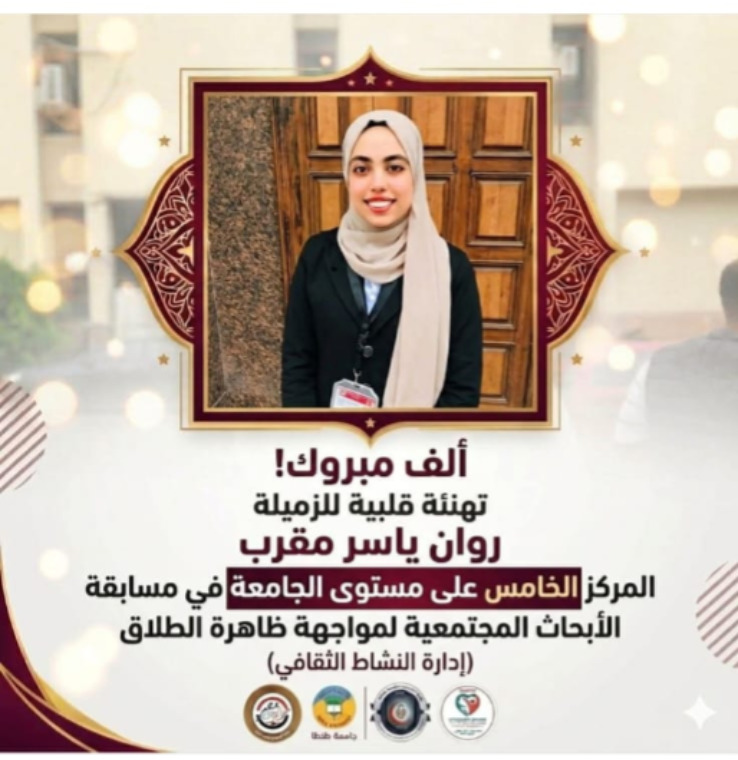 تتقدم السيدة الأستاذ الدكتور عفاف بصل عميد كلية التمريض جامعة طنطا بأرق وأطيب الأمنيات القلبيه الصادقة للطالبة/ روان ياسر مقرب المقيدة بالمستوى الثاني بالكلية وذلك لحصولها على المركز الخامس على مستوى الجامعة في مسابقة الأبحاث المجتمعية لمواجهة ظاهرة الطلاق متمنية لها دوام التوفيق والنجاح.