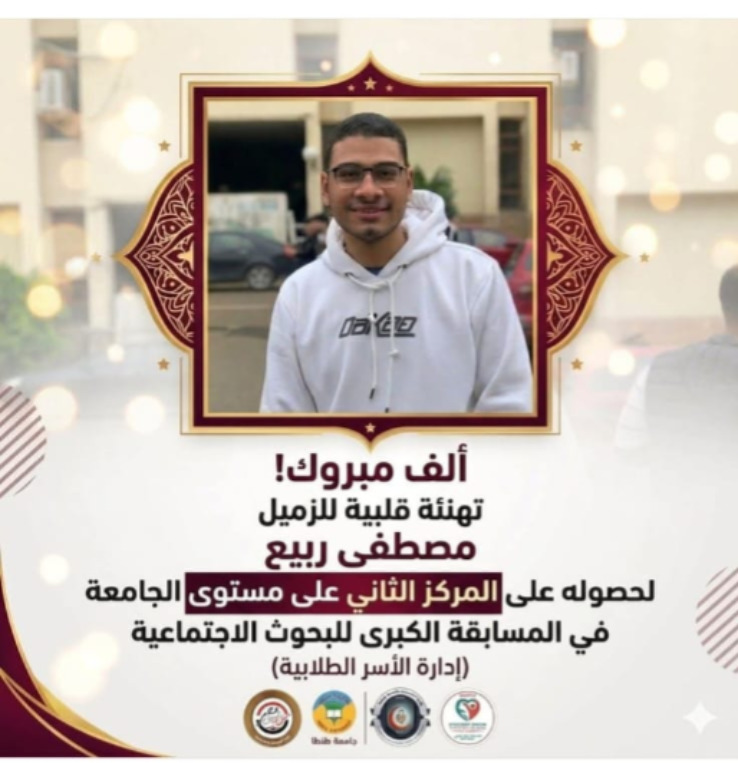 تتقدم السيدة الأستاذ الدكتور عفاف بصل عميد كلية التمريض جامعة طنطا بأرق وأطيب الأمنيات القلبيه الصادقة للطالب / مصطفى ربيع سلامة -المقيد بالمستوى الثالث بالكلية وذلك لحصوله على المركز الثاني على مستوى الجامعة في المسابقة الكبرى للبحوث الاجتماعية متمنية له دوام التوفيق والنجاح.