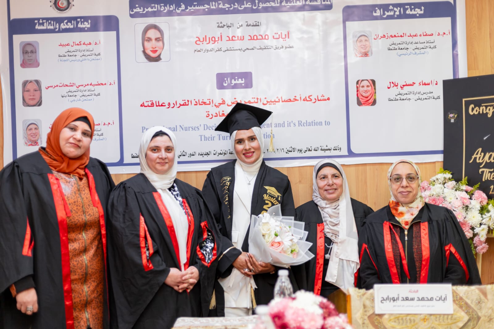 شهدت كلية التمريض جامعة طنطا، انعقاد المناقشة العلنية لرسالة الماجيستير في علوم إدارة التمريض المقدمة من الباحثة / ياسمين سامى محمد أبو سعد بعنوان " العلاقة بين مناخ السلامة المؤسسى والاستمرارية في رعاية المرضى بين الممرضين " وتكونت لجنة الحكم والمناقشة من: