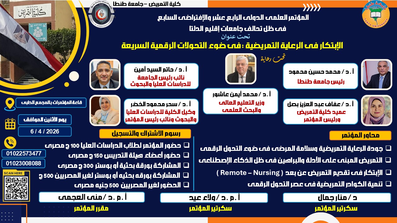 في إطار حرص كلية التمريض جامعة طنطا علي دعم البحث العلمي وتعزيز تبادل الخبرات والمعرفة بين الباحثين ومواكبة التطورات الحديثة في مجال التمريض في ظل تحالف إقليم جامعات الدلتا تعلن الكلية عن تنظيم مؤتمرها الدولي الرابع عشر والإفتراضي السابع بعنوان "الإبتكار في الرعاية التمريضية في ضوء التحولات الرقمية السريعة" وذلك تحت رعاية أ.د/ محمد أيمن عاشور وزير التعليم العالي والبحث العلمي و أ.د/ محمد حسين محمود رئيس جامعة طنطا و أ.د/ حاتم السيد أمين نائب رئيس الجامعة للدراسات العليا والبحوث و أ.د/ عفاف عبدالعزيز بصل عميد كلية التمريض